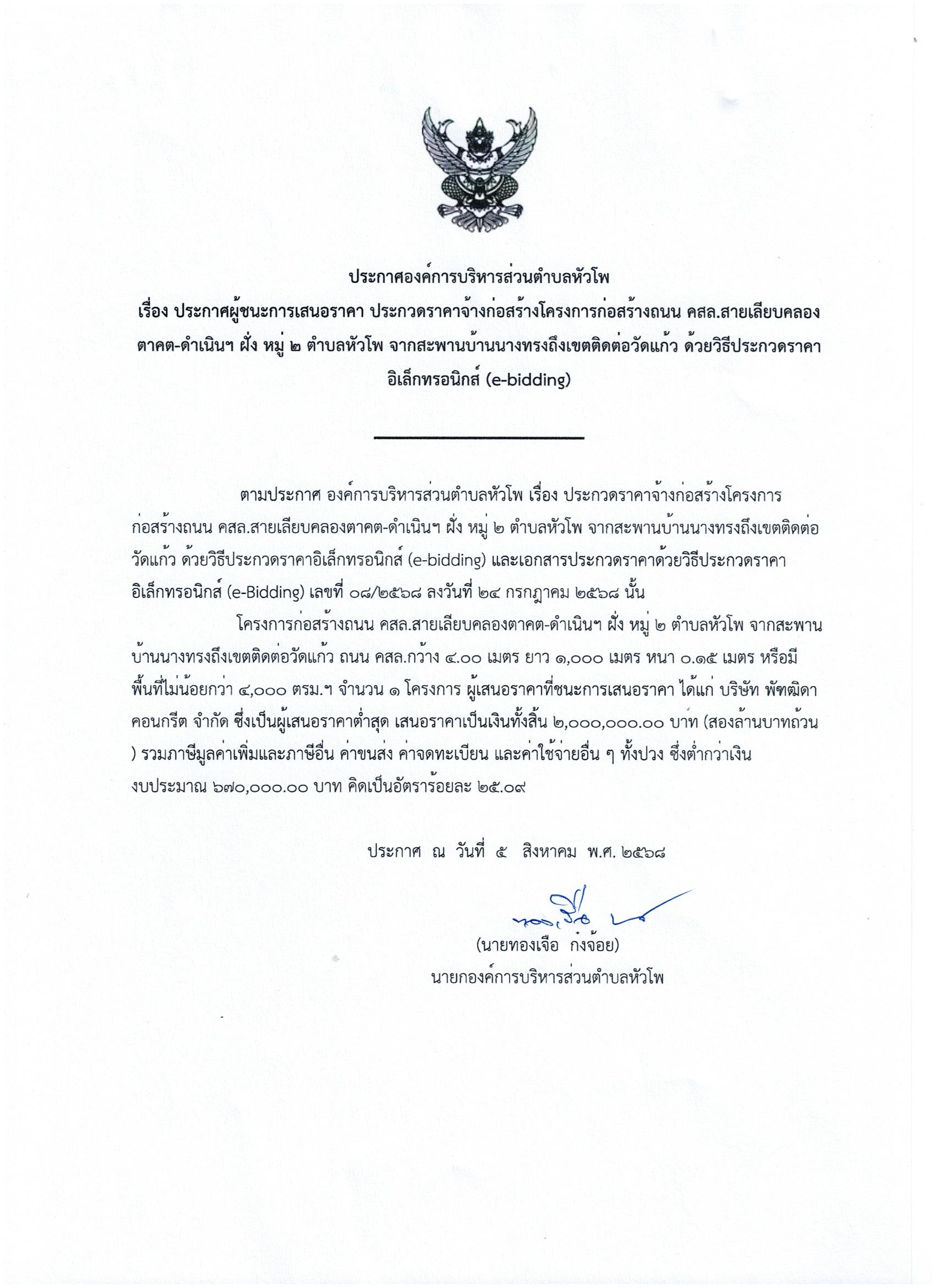 ประกาศผู้ชนะการเสนอราคา ประกวดราคาจ้างก่อสร้างโครงการก่อสร้างถนน คสล.สายเลียบคลองตาคต-ดำเนินสะดวก ฝั่ง หมู่ที่ 2 ตำบลหัวโพ จากสะพานบ้านนางทรงถึงเขตติดต่อวัดเเก้ว ด้วยวิธีการประกวดราคาอิเล็กทรอนิกส์( e-bidding)
