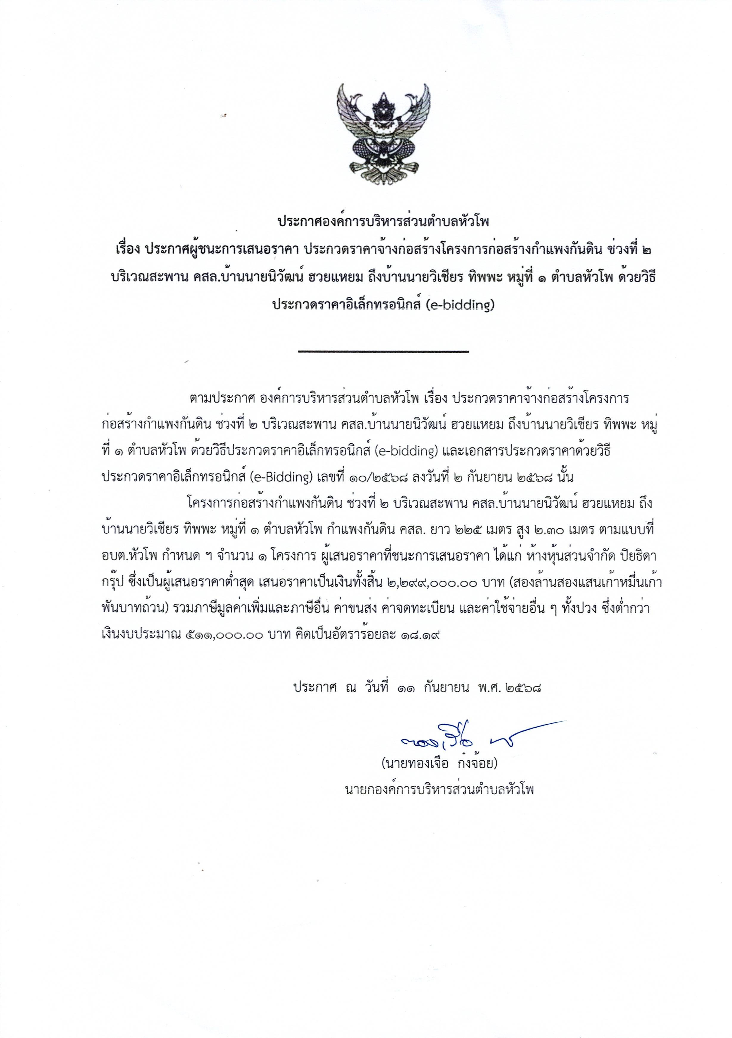 ประกาศผู้ชนะการเสนอราคา ประกวดราคาจ้างก่อสร้างโครงการก่อสร้างกำเเพงกันดิน ช่วงที่ 2 บริเวณสะพาน คสล.บ้านนายนิวัฒน์ ฮวยเเหยม ถึงบ้านนายวิเชียร ทิพพะ หมู่ที่ 1 ตำบลหัวโพ ด้วยวิธีการประกวดราคา (e-bidding)