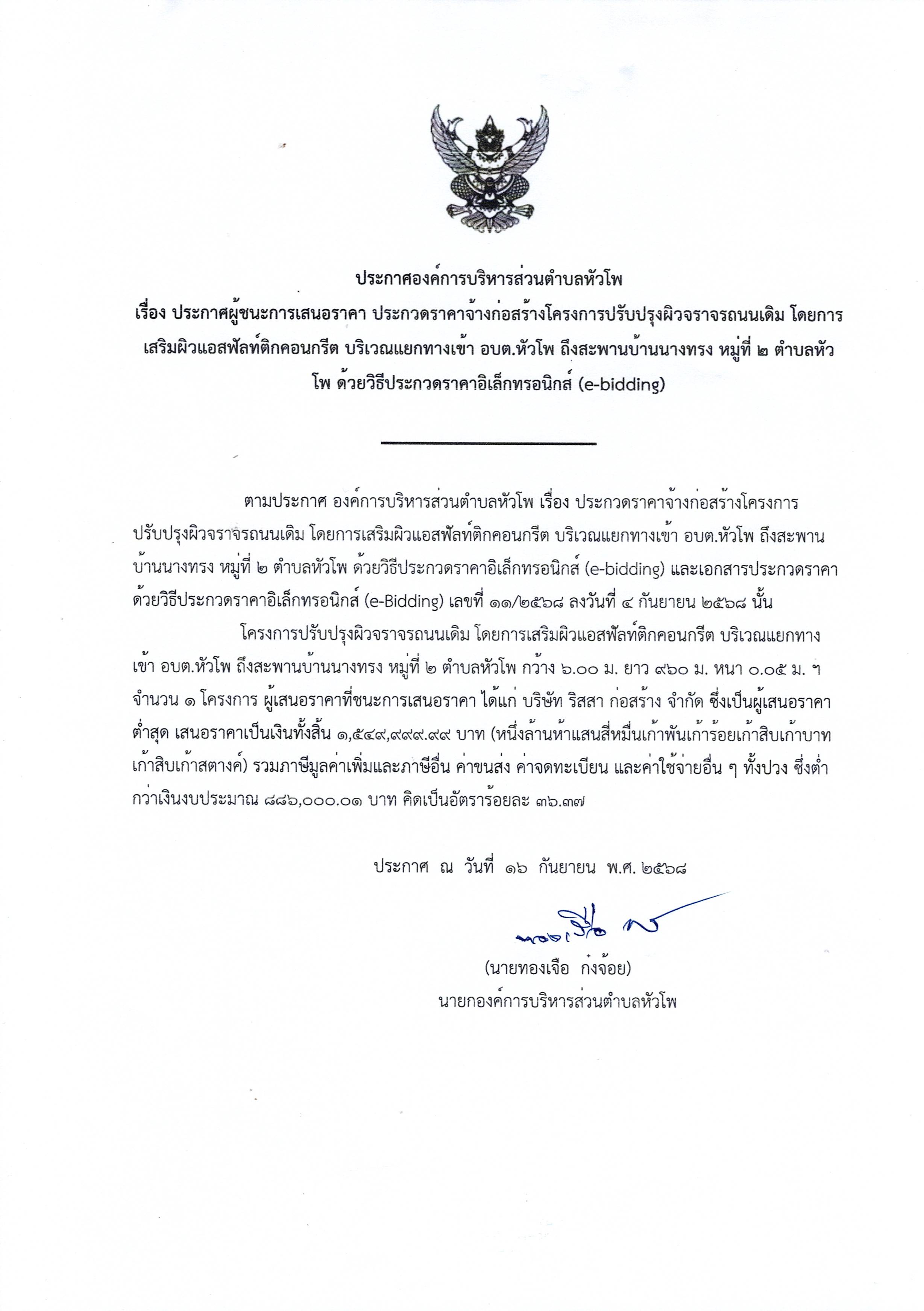 ประกาศผู้ชนะการเสนอราคา ประกวดราคาจ้างก่อสร้างปรับปรุงผิวจราจรถนนเดิม โดยการเสริมผิวเเอสฟัลท์ติกคอนกรีต บริเวณเเยกทางเข้า อบต.หัวโพ ถีงสะพานบ้านนางทรง หมู่ที่ 2 ตำบลหัวโพ ด้วนวิธีประกวดราคาอิเล็กทรอนิกส์ ( e-bidding)